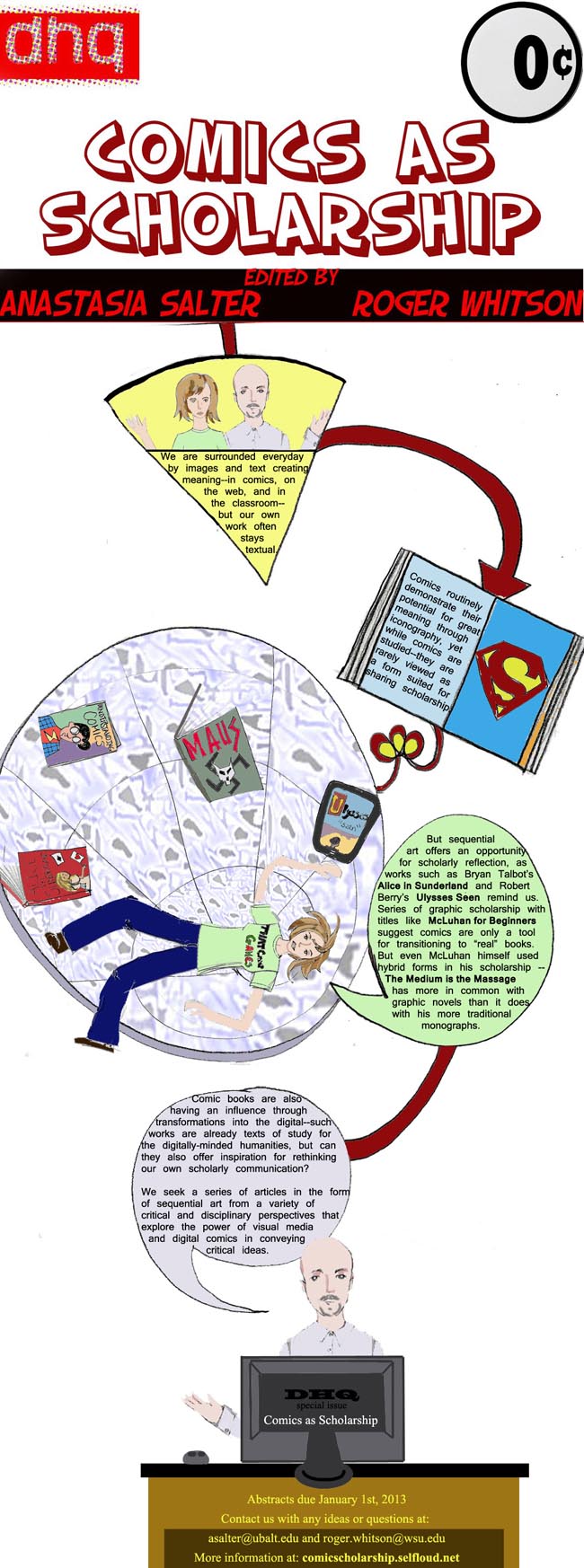 January 1st, 2013 -- Abstracts due! Submit a 300-500 words abstract to asalter - at - ubalt.edu and roger.whitson - at - wsu.edu. Your summary should include your intended medium and any technical requirements to display your work (server-side technology, HTML5 or Javascript, Flash, etc.). Feel free to contact us in advance with ideas and review the guidelines for .